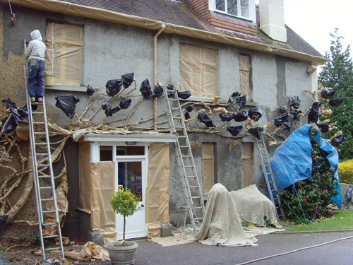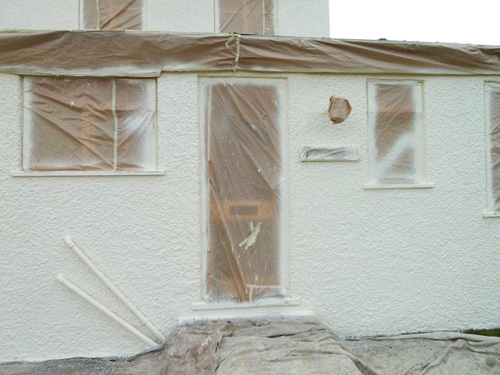 A house masked up with coating applied.